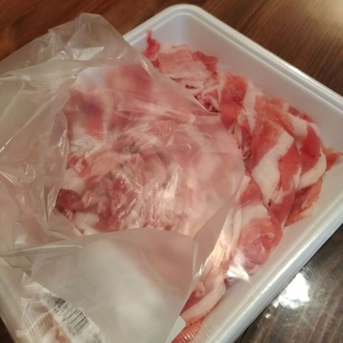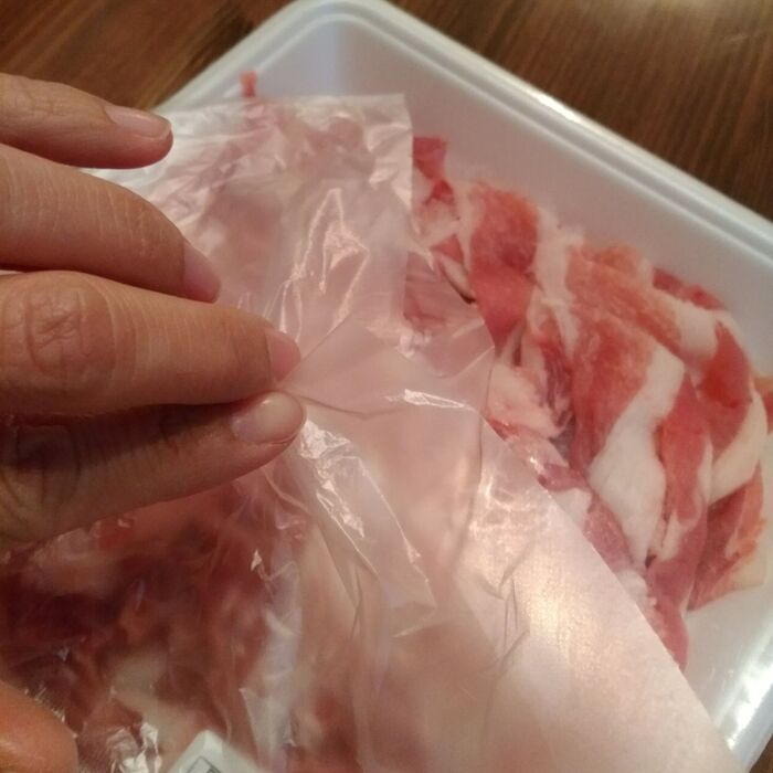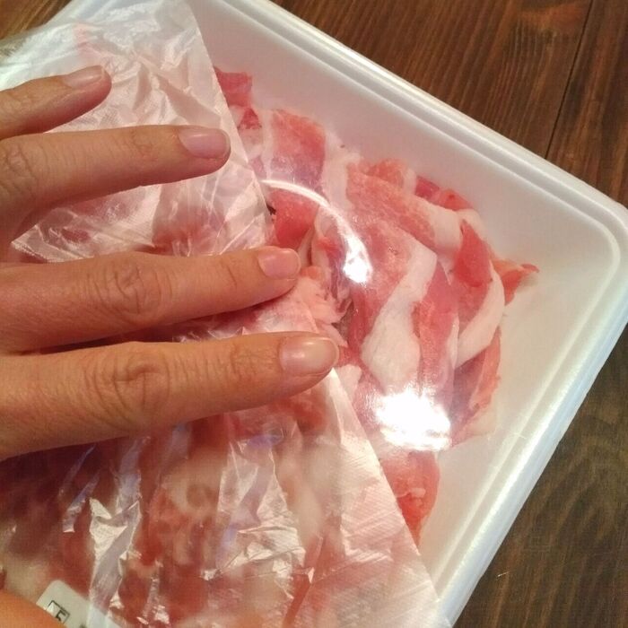 購入した肉や魚のパックの上に、ポリ袋を乗せます。