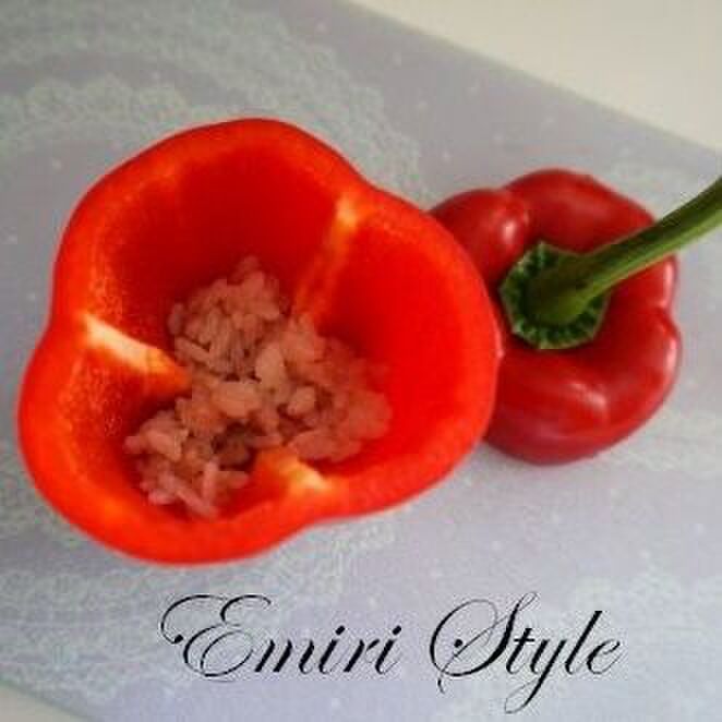 ②残りご飯をお好みで、塩コショウ(分量外)で味付けて、パプリカの1/3の高さ位まで詰めます(*^▽^*)