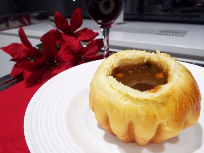 そのまま食べてももちろんおいしいのですが、アマノフーズさんのオススメは丸いパンを器にすること。パンの中身をくり抜いて、その中にシチューを流し込めば、シチューポットパンの出来上がり♪お好みでパセリを散らしたり、チーズを乗せてオーブンで焼いても◎!