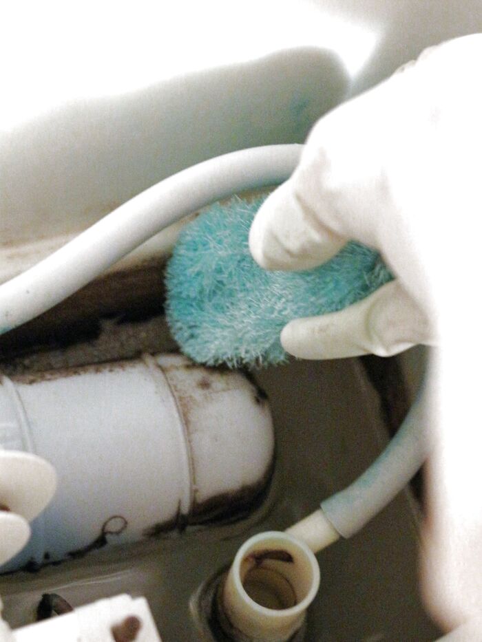 掃除2:タンク内部の汚れをナイロンブラシで落とす(洗剤は一切不要)。
