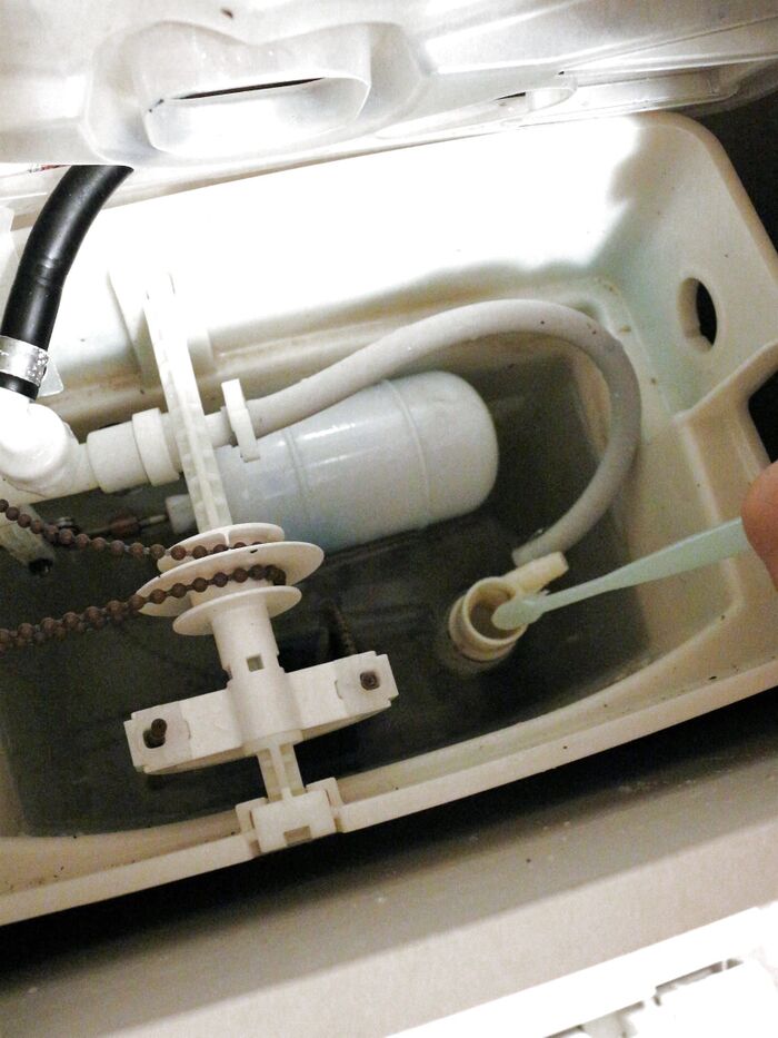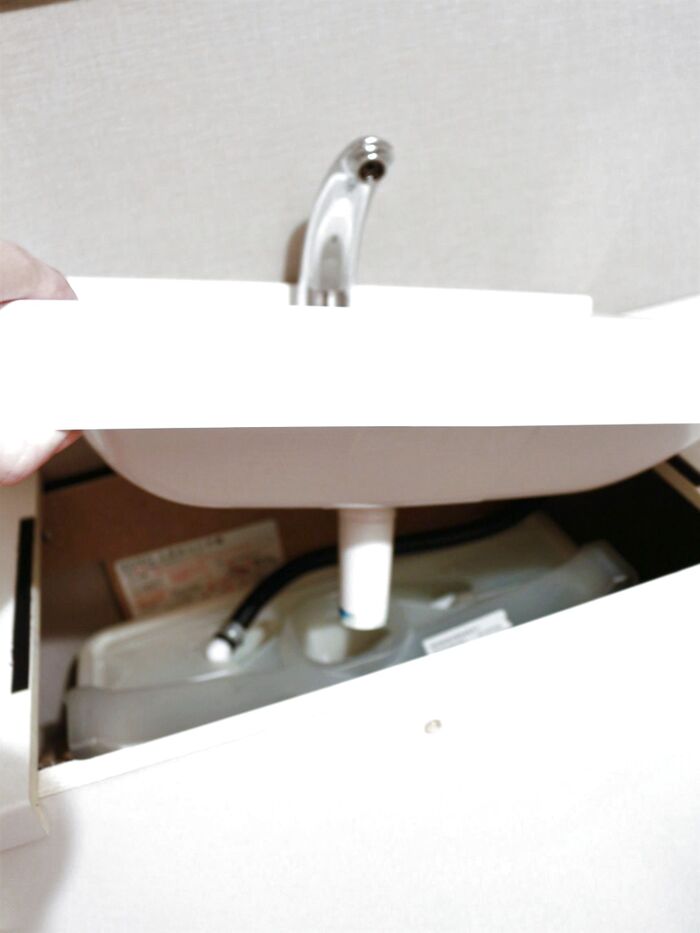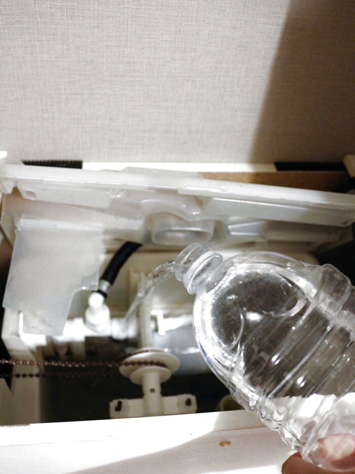 掃除1:まず、ゴム手袋をしたら水タンクの蓋を開ける(ホースが外れないように)。