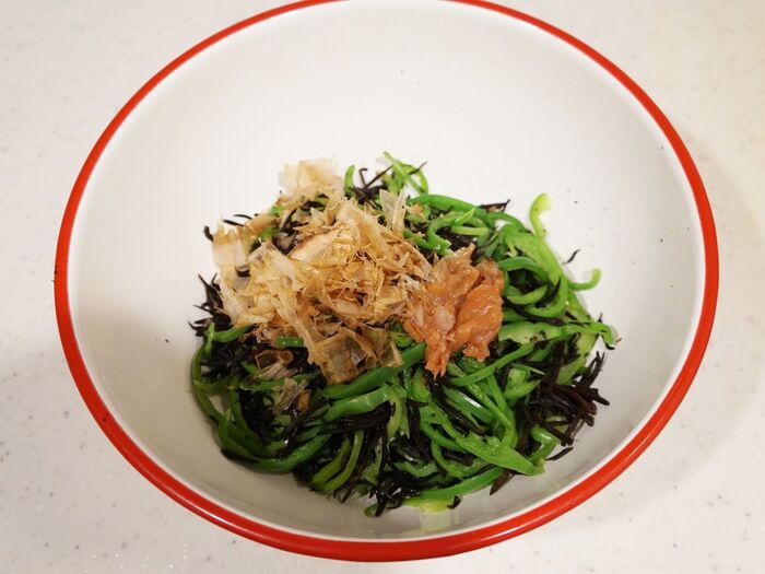ボウルに入れて、茹でたピーマンと芽ひじき、鰹節(パック)、(A)を加えて良く混ぜ合わせて完成です。(食べきれない分は清潔な容器に入れて冷蔵庫で2~3日保存可能です。)
