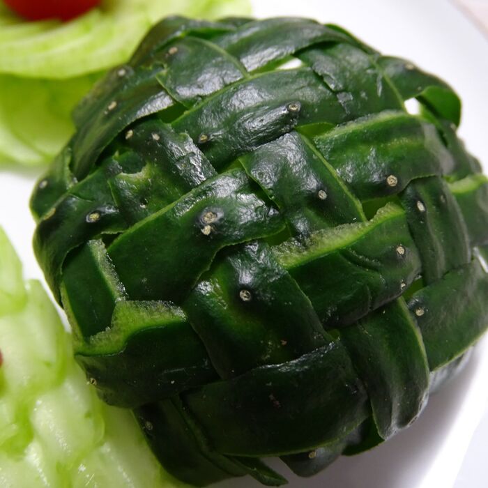 スライスした胡瓜の細い所とクズを詰めて丸く整形する。