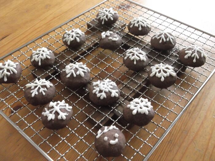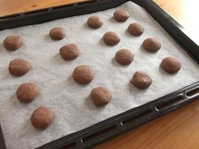 このあと、丸く形を整えて軽くつぶし、オーブンペーパーを敷いた天板に並べる。