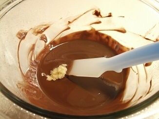 チョコが溶けたら、湯せんから外し、おろし生姜を加えて混ぜる。