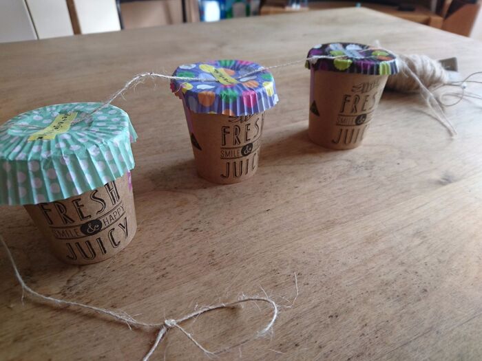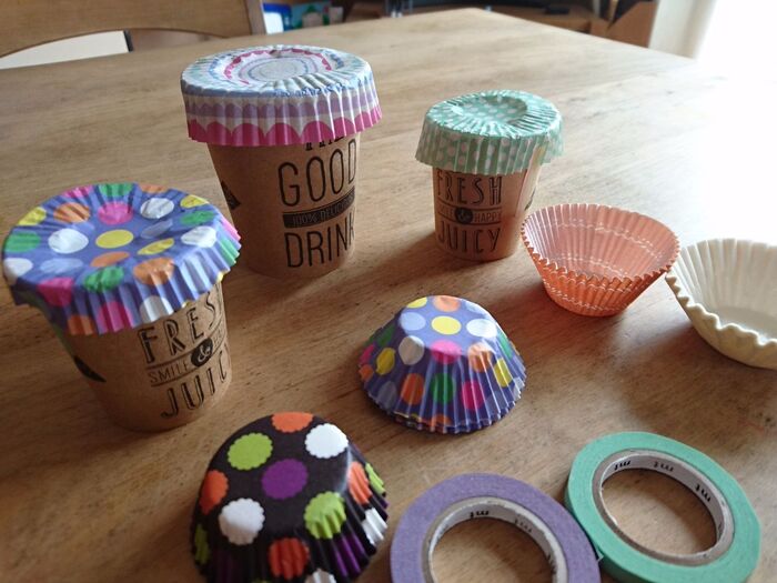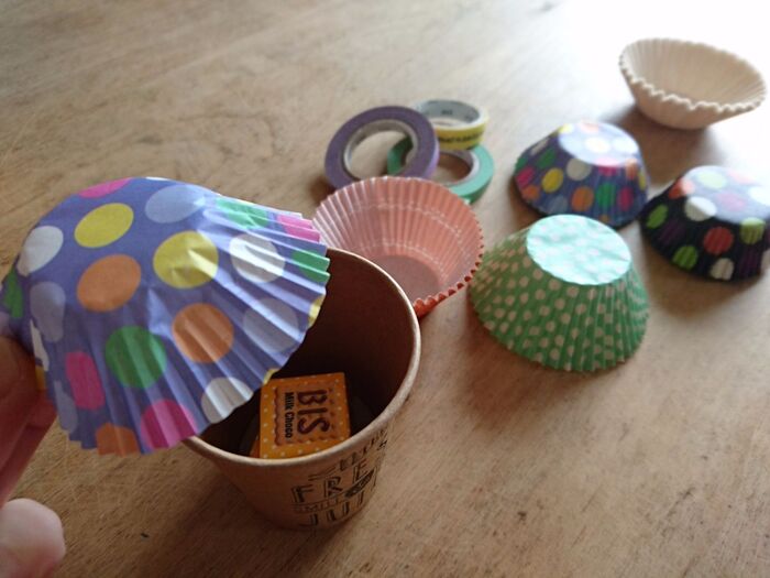 マフィンカップを逆さにして、紙コップの蓋にします。サイド二ヶ所をマステで留めます。