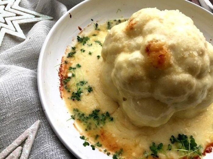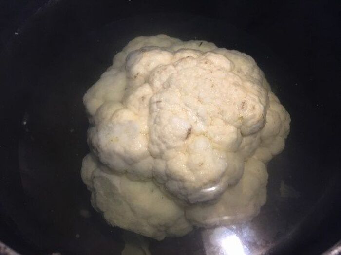 カリフラワーは葉と軸の付け根を少し切り落とし、丸ごと熱湯で3分ほど茹でる