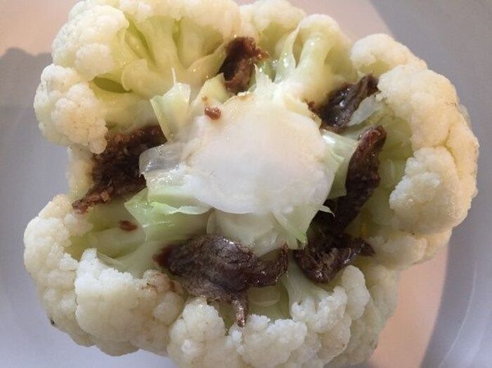 ザルにとり水気をきり、ひっくり返してすき間にアンチョビを詰める
