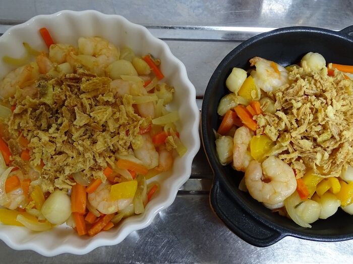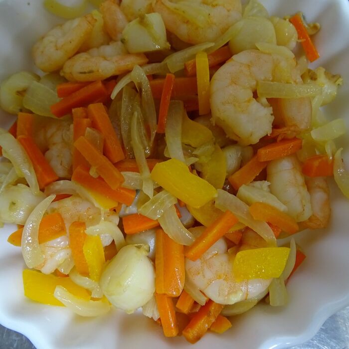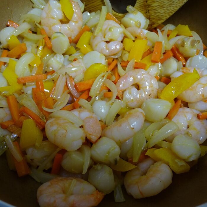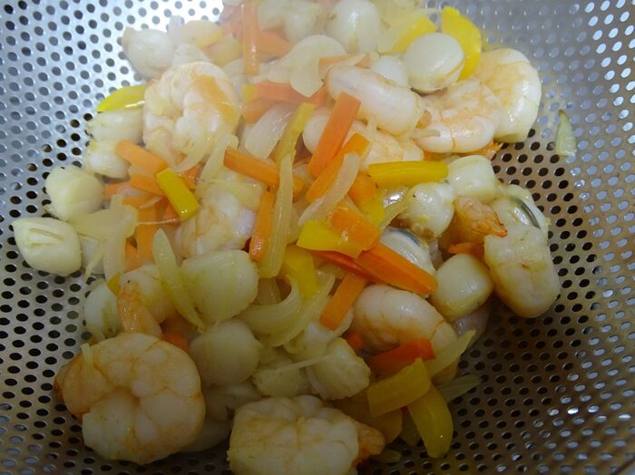 海老ホタテmixを加え、少し炒める。