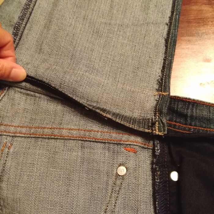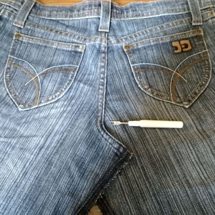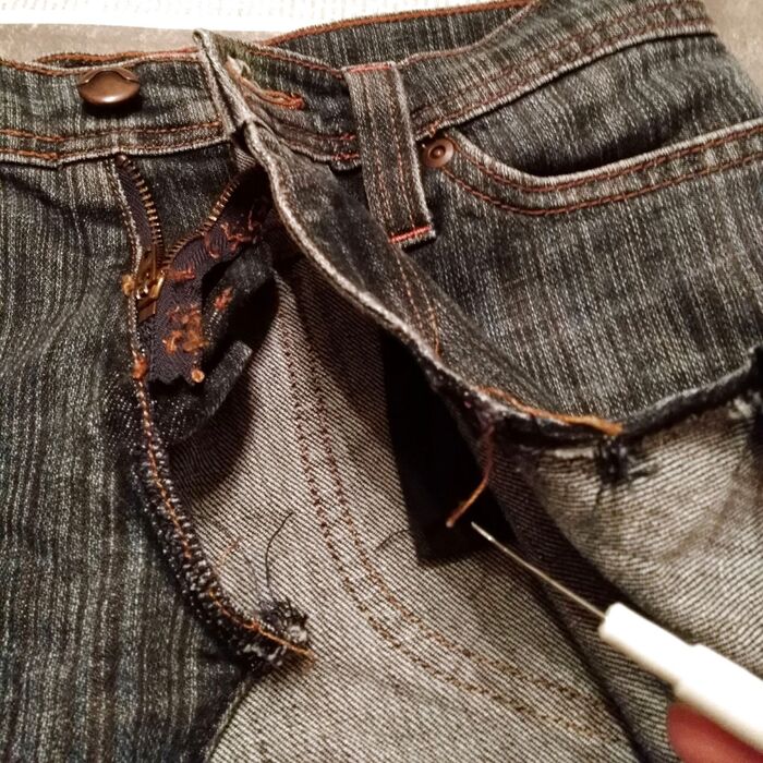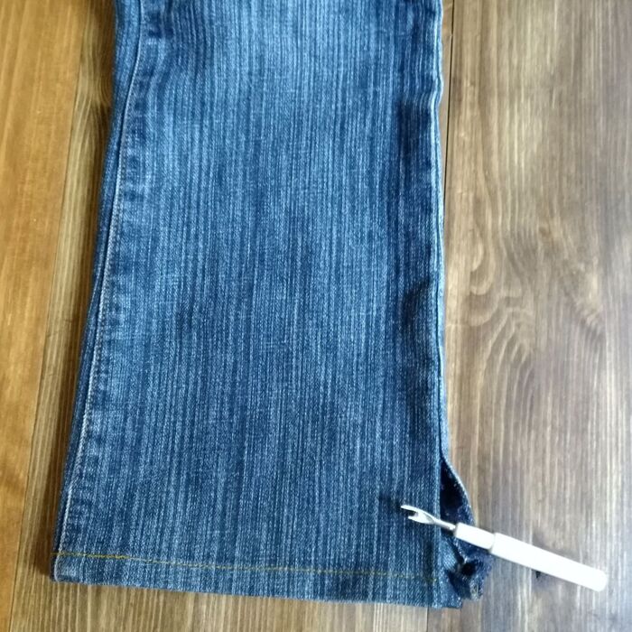 このステッチもデザインにしたいので、ジーンズ外サイド側だった縫い目をほどきます。