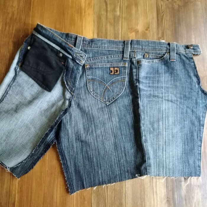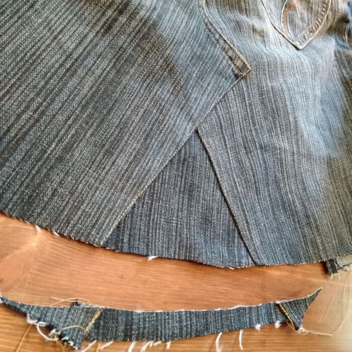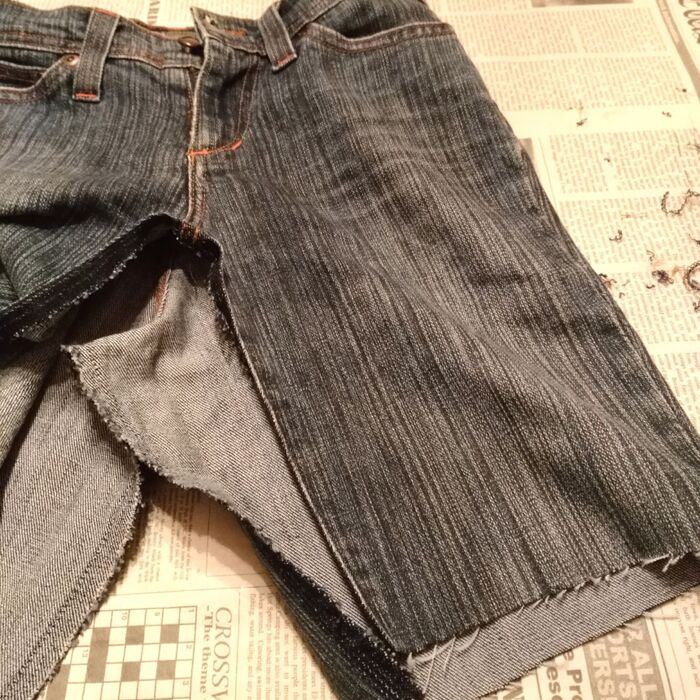 縫い目の部分を中心として、左右で布の幅が違うため、細い方(ジーンズ前側)の幅に合わせて太い方(ジーンズ後ろ側)をカットします。中心で半分に折って、合わせてカットする感じです。