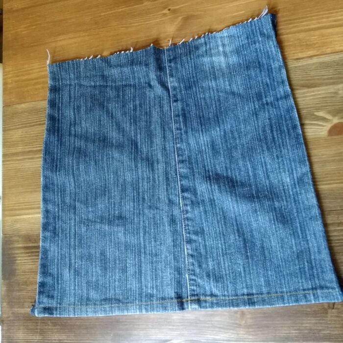 先ほど胸当て部分にカットしたジーンズ足の部分の残りの端切れを開いて(ほどいてもカットしても可)、裏から当てます。