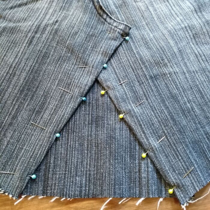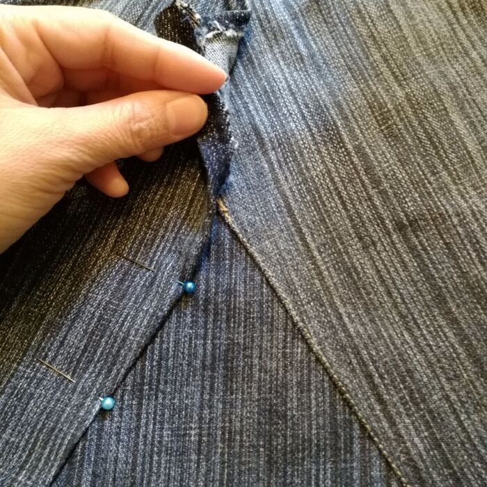 先ほど開いたジーンズ股の部分、縫い代を折り返して、当てた布と合わせてまち針でとめておきます。