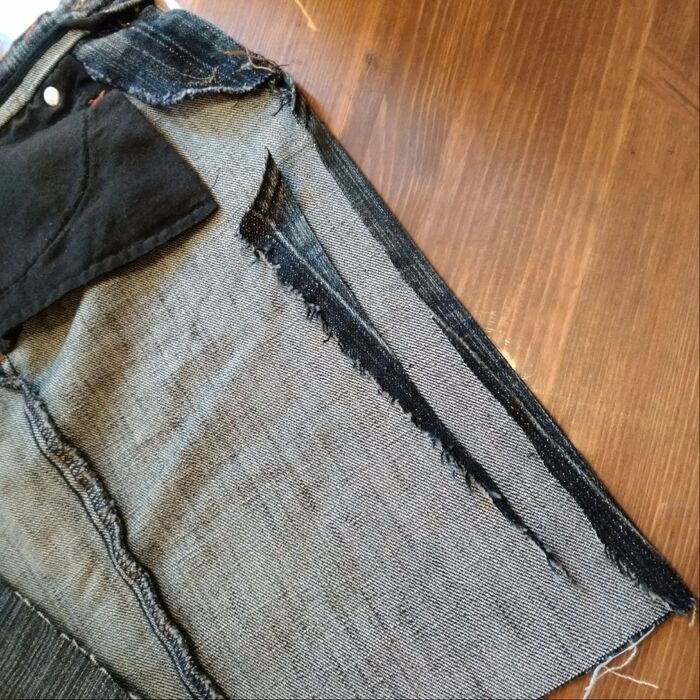 ジーンズの前部分(ファスナー側)がエプロン腰巻き部分の波子になりますが、股部分の余分な布を、画像のように縫い代を残してカットします。