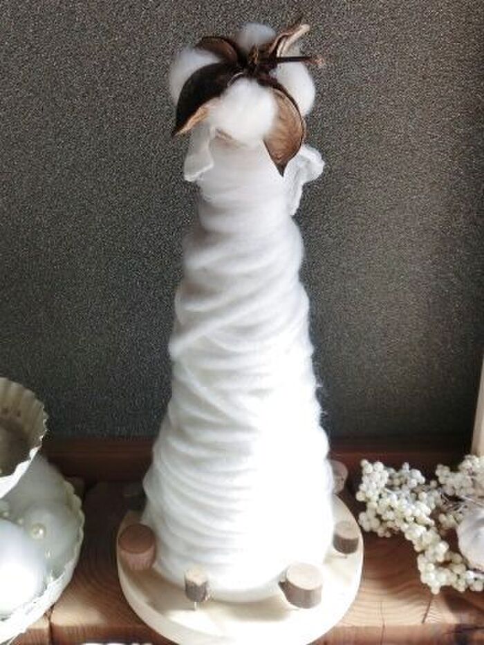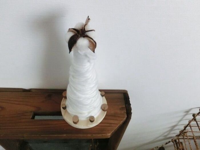 徐々に上部に巻いて行くに連れ巻き数を少なくし、ツリーのシルエットになるように調整しながらクルクル巻いて行きます。