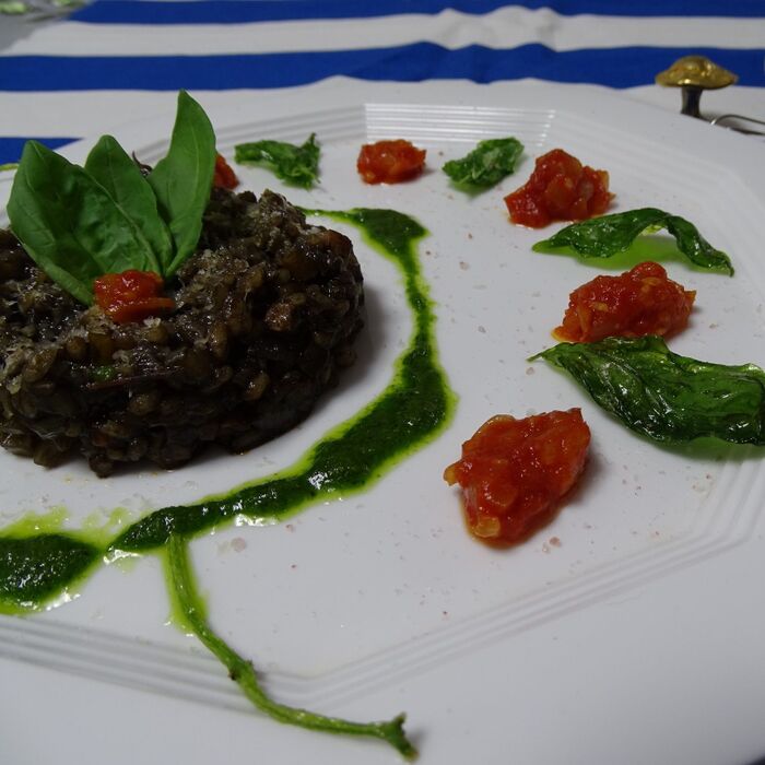 セルクルでリゾットを盛り付けて・・・・生バジルを3枚載せる、その重なりにトマトを少し載せて押さえます・・・・すると