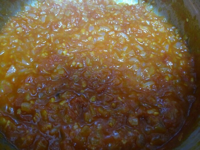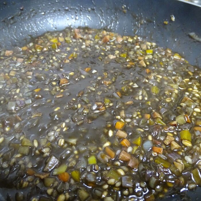コンソメパウダー、fondue de tomate、イカ墨パウダーを加えて煮込んでいきます。