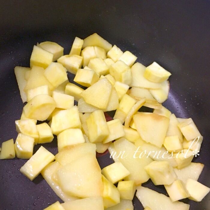 熱した鍋に、バターとりんごを入れてサッと炒め、②のさつまいもとさとうを入れて少し焦げ目がつくぐらいまで炒める。《中火〜弱火》