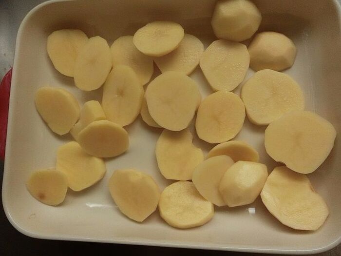 じゃが芋は皮をむいて1㎝の輪切りにし、耐熱容器に並べます。ふんわりラップをかけ電子レンジ600wで4~4分半加熱します。
