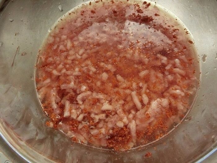 別の耐熱容器に、水、ひき肉、包丁で細かく切ったハッシュポークを入れます。電子レンジ600wで2分加熱しよく混ぜ合わせます