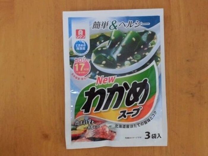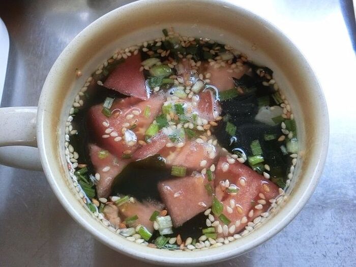 トマトは1.5㎝角に切ります。カップにわかめスープとお湯を入れ、トマトとチーズを入れます。