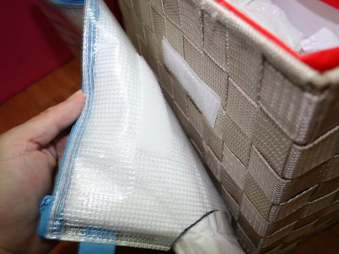 両サイドのカゴは引き出せるので引き出す度にゴミ袋入りの連絡袋が落ちてしまわないように、マジックテープを連絡袋とカゴに取付け固定しました