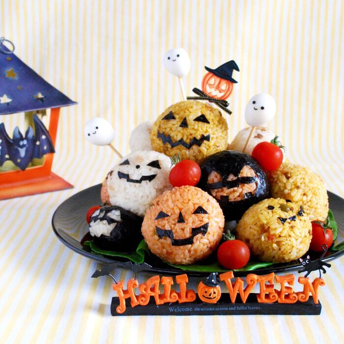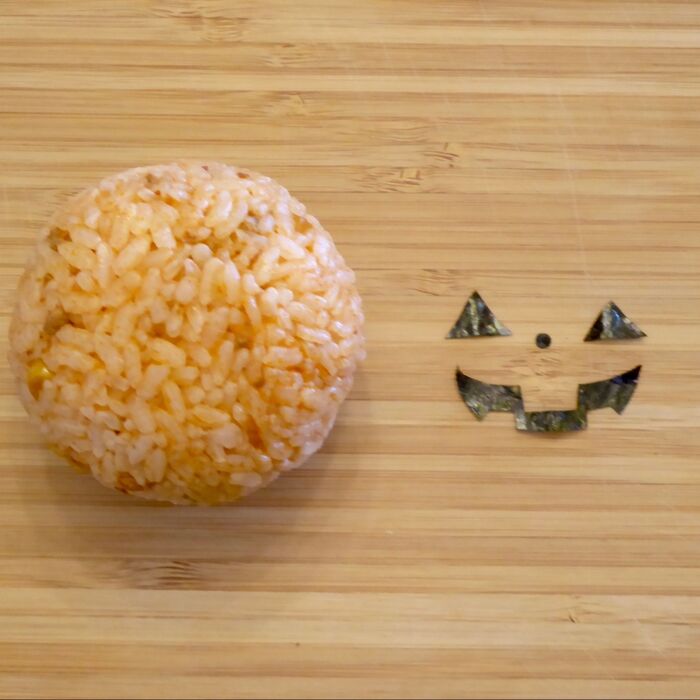 海苔で作った顔パーツを貼り付けます。