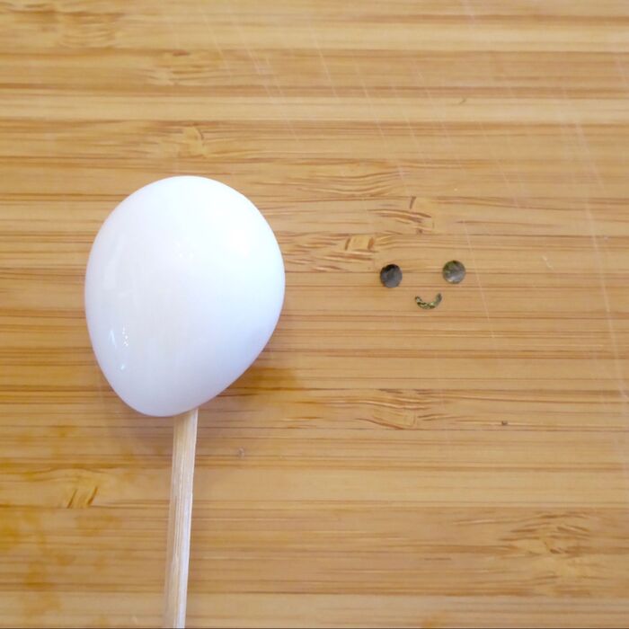 2:竹串に刺したうずらの水煮に海苔で作った顔パーツをマヨネーズではります。