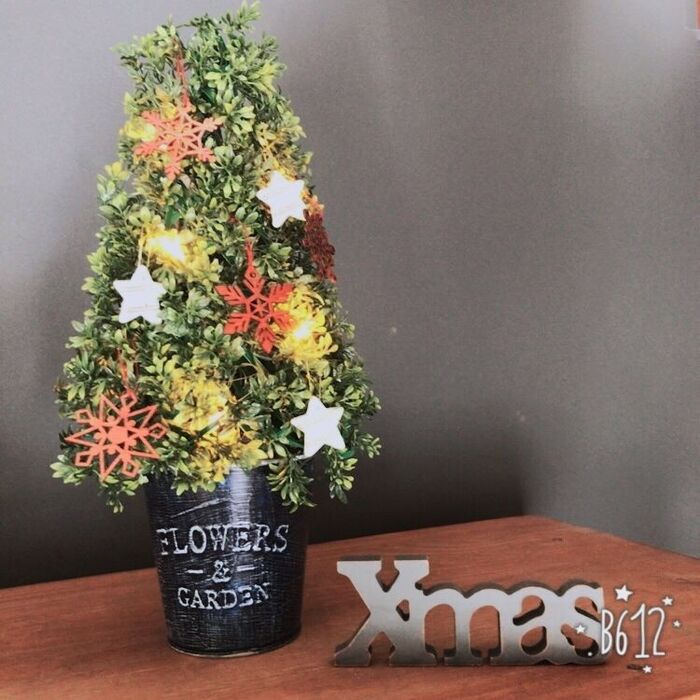 *ツリーの中にライトを入れてバケツに乗せてオーナメントをつけたら出来上がり。