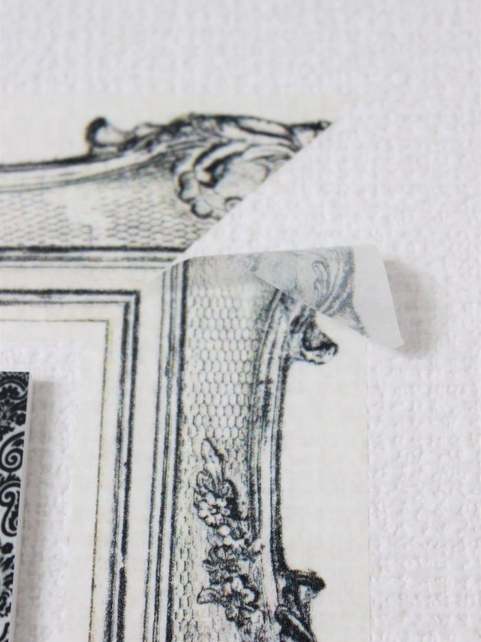 縦と横のマスキングテープが交わる角は、カッターで45度にカットすると、フレームの柄がぴたりと合います。(壁をキズつけないように優しくカッターを入れます。)