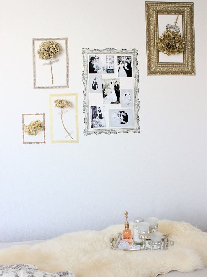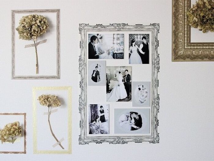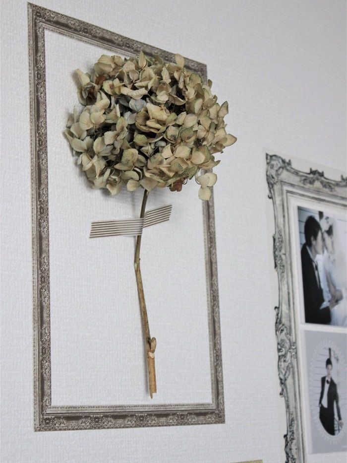 他のフレーム柄マスキングテープで、フレームを周りにいくつか作り、紫陽花のドライフラワーと組み合わせて飾れば、壁ギャラリーのできあがりです。