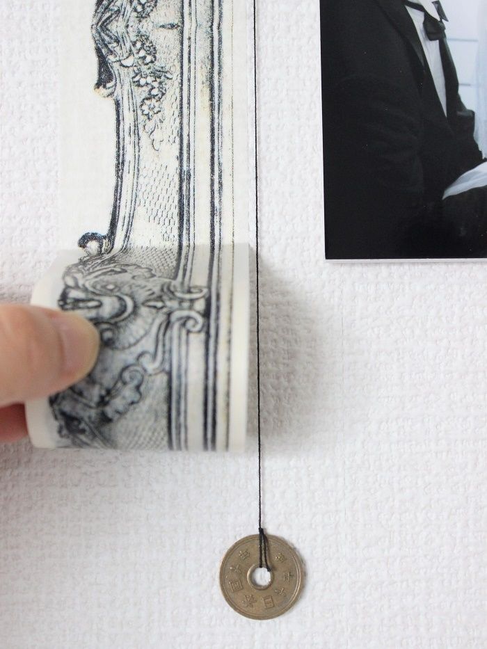 5円玉に糸を結び付けて壁に仮止めし、それをガイドにマスキングテープをまっすぐ縦に貼ると、床に対して垂直に貼ることができます。