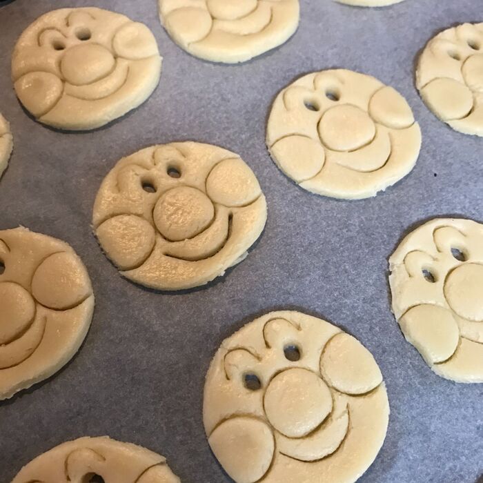 冷蔵庫から取り出した生地を3mm厚さに伸ばしてまるく抜き、オーブンシートを敷いた天板に並べた後に顔パーツの線をつけていく感じです。