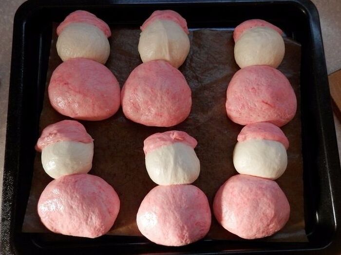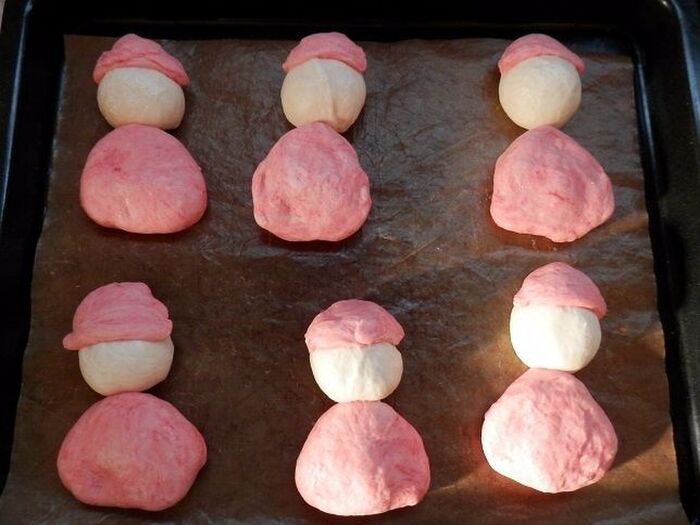 白い生地と、三角にした赤い生地を天板に並べます。残りの赤い生地を6等分にし、三角にして帽子を作ります。