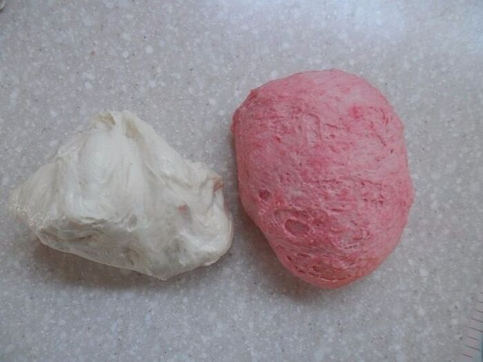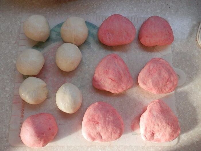 白い生地を6等分にして丸めます。赤い生地は7等分にして6つを三角にします。