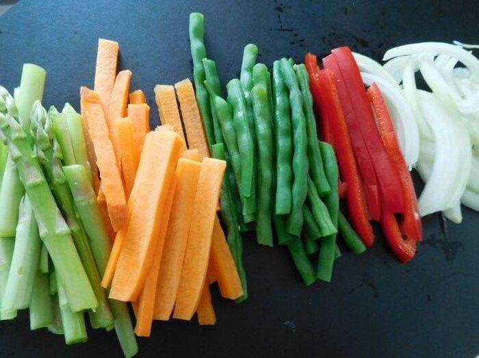 ニンジンは6cm長さの棒状に切り いんげんも6cm長さに切ってさっと下茹でし 玉ねぎはくし切りにしてほぐし 赤ピーマンは半分に切って5mmの縦切り