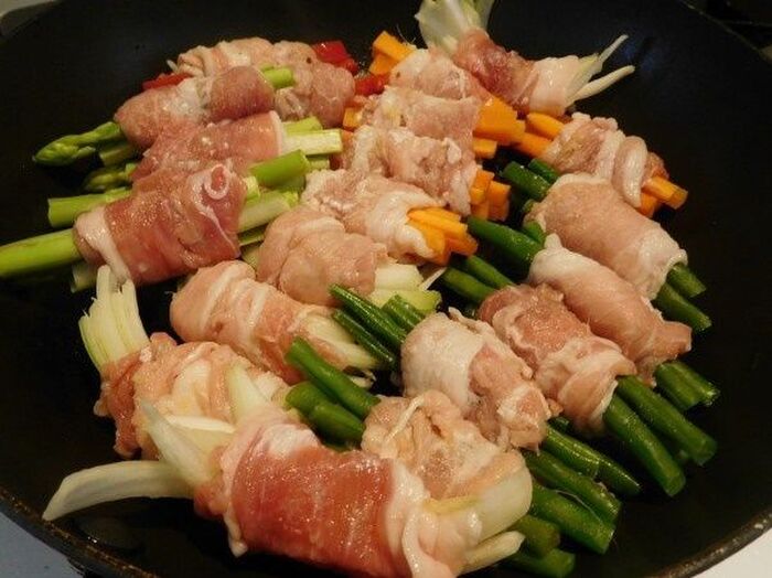 フライパンにオイルを入れ 野菜をまいた豚肉の巻き終わりを下にして入れころがせながら全体を焼く
