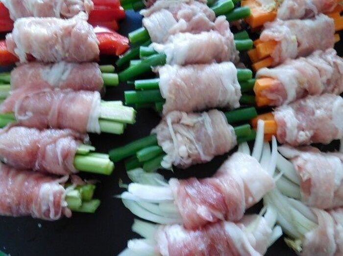 それぞれの野菜数本を真ん中の部分を中心に肉を巻き付け巻き終わりを下にしておく