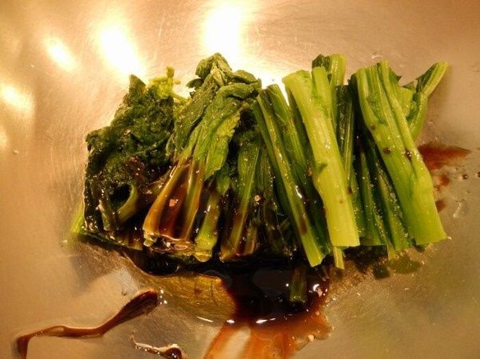 なばなはさっと茹でて半分に切り バルサミコ オリーブオイル 塩・コショウで味を付ける