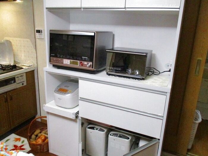 でも、忘れっぽいので(笑)棚の中にあるものは、しまう場所を決めて、仲間同士揃えるように心がけています、使用頻度が毎日ではない、しまい込むと面倒になってしまいがちなホームベーカリー2台や、たこ焼き器・天板他(画像右下)などは、取り出しやすい下段の定位置に収納しています(重いので安全対策にも!)