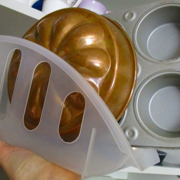 ケーキなどの型も100円ショップで購入の画像のケースに、小分けして、中に入れたものが、動いかないようにぴっちりめに立てて収めています