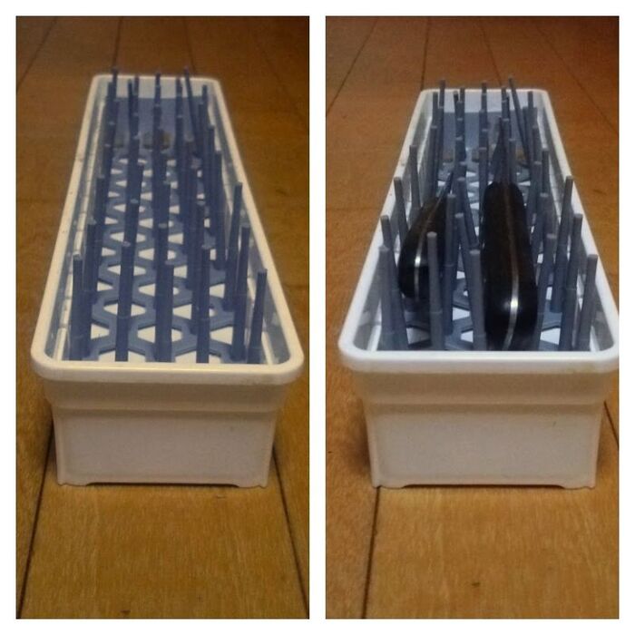 刃が下を向いているので安心です。必要な包丁が一目でわかってサッと取り出せるようになりました。