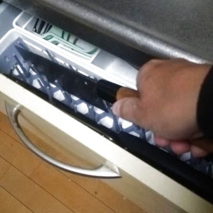 引き出しを動かす振動で包丁が動いてしまい、少しづつケースを傷つけていたようです。