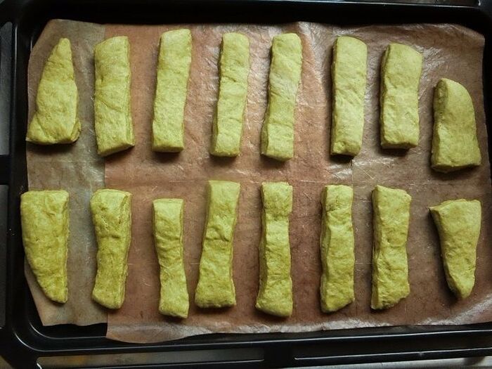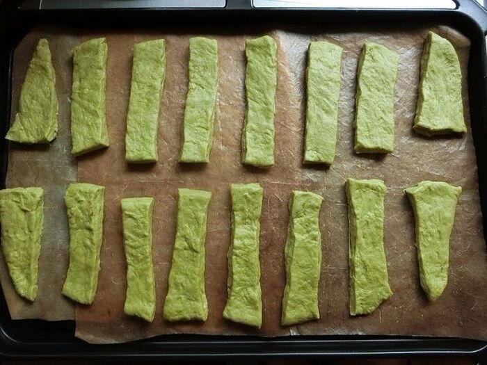 縦20㎝、横25センチくらいに薄くのばし、スティック状に16等分にします。