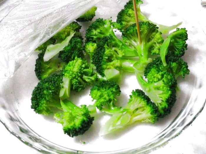 ④耐熱皿または、耐熱ボウルにブロッコリーを、平らに並べ、ラップをふんわりかけて、