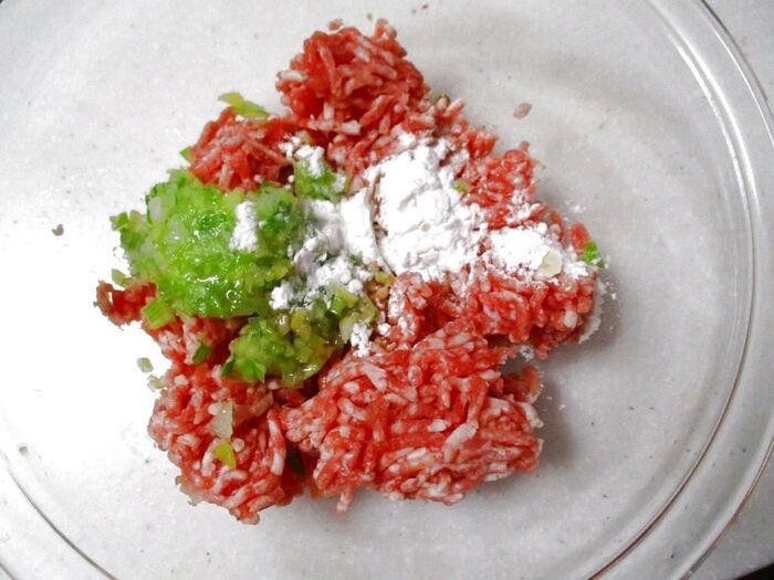 ①ボウルに、豚ひき肉と*の調味料とみじん切りした長ねぎと生姜も入れて、
