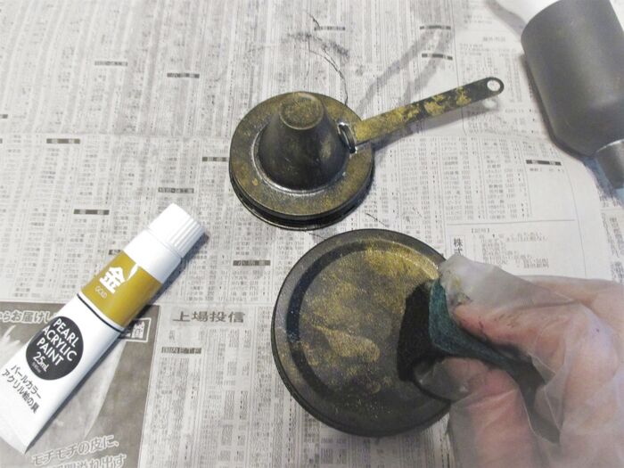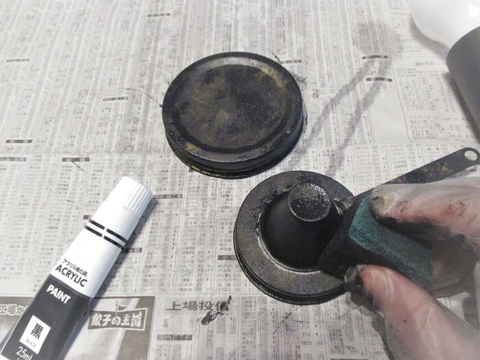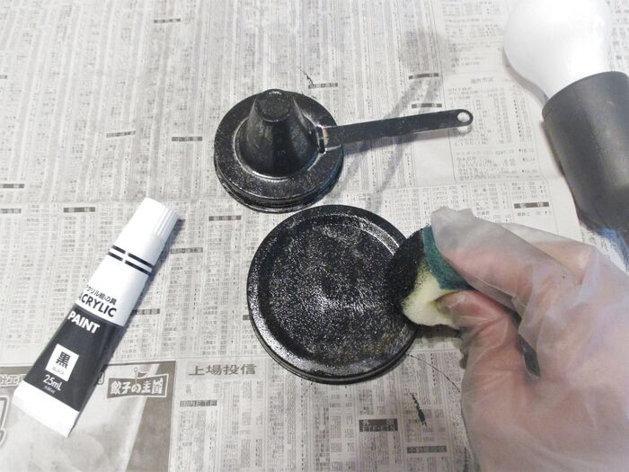 台所用スポンジにアクリル絵の具の黒をつけて、ぽんぽんと塗っていく。