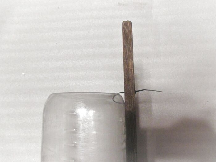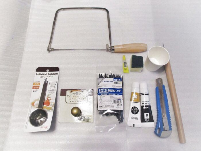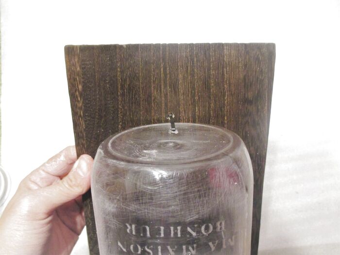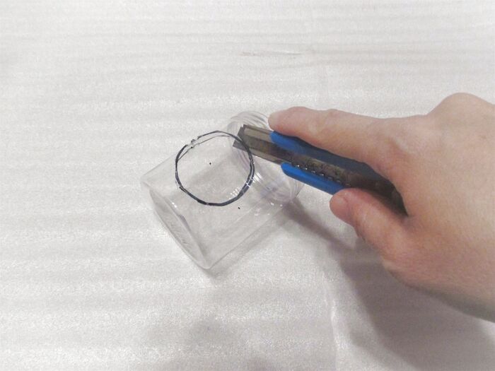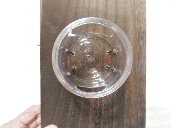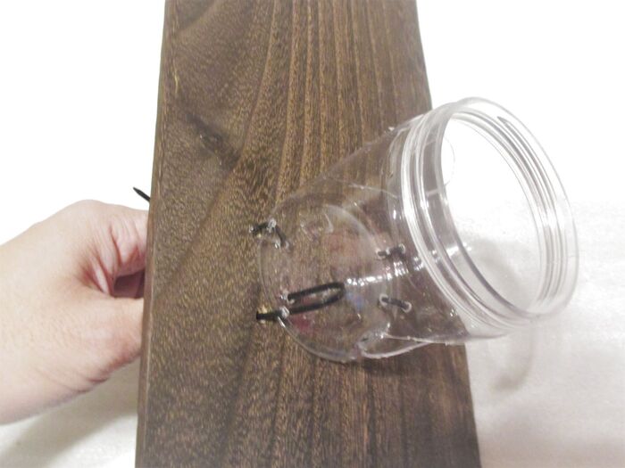 PET容器に4か所、木板に4か所キリで穴をあけて結束バンドでつなげる。