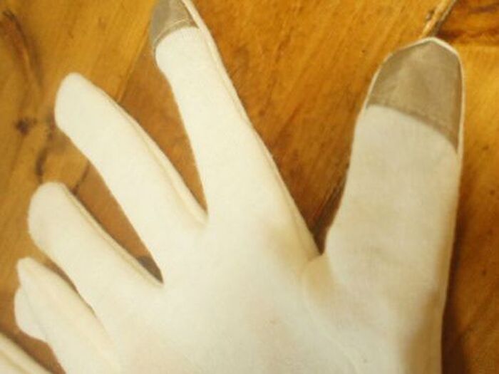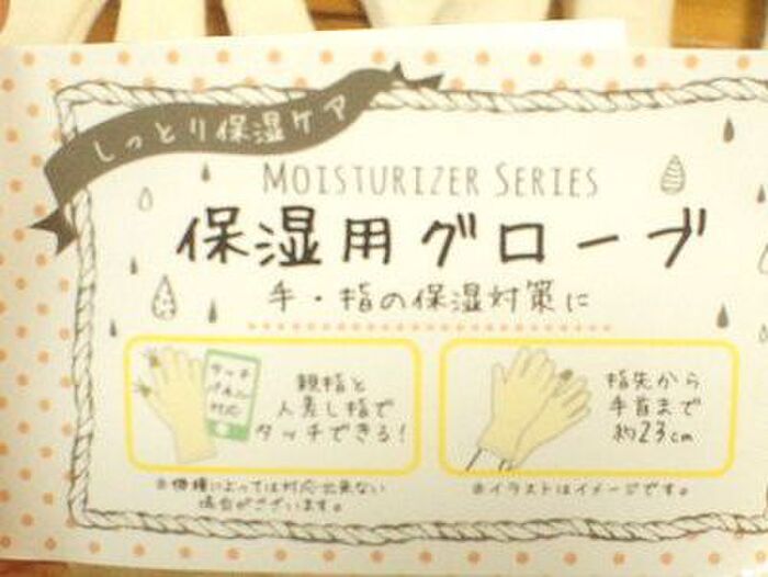 キャンドゥの「保湿用グローブ」は、通気性のいい綿100%で、親指と人差し指の先に導電性のある生地が使われてるからスマホの操作も◎?