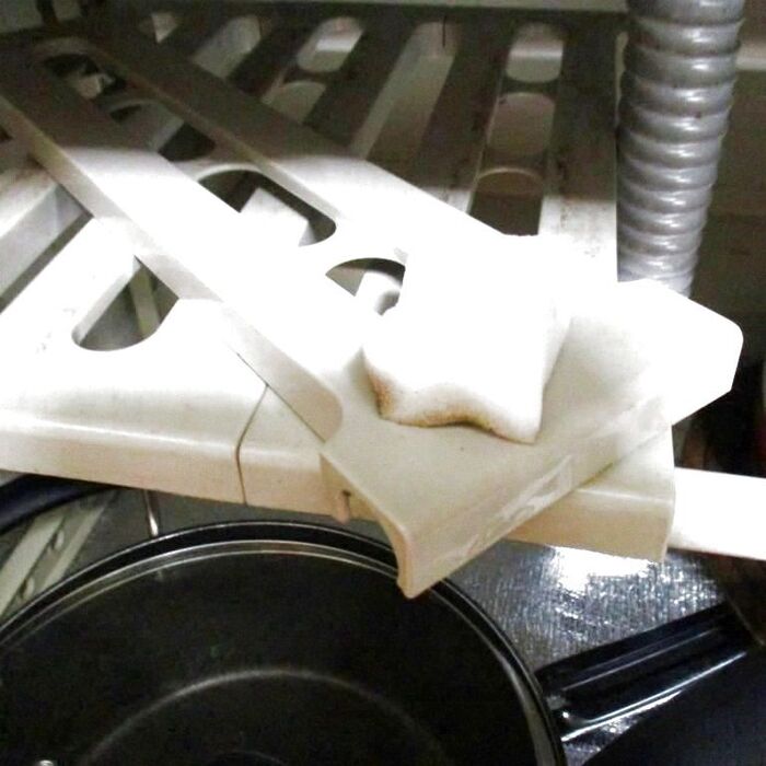 シンク下の方は長い間使っているうえ、フライパンなどを多くしまっているので少々汚れていますね、水気ありのメラミンスポンジ(白いもの)で綺麗にこすってとります、